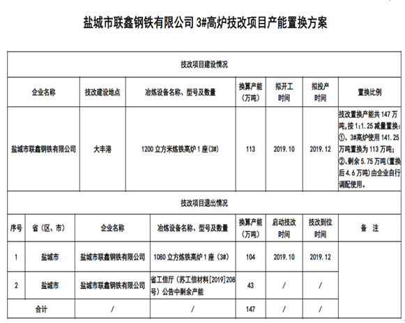 关于盐城市联鑫钢铁有限公司3#高炉技改项目产能置换的公告