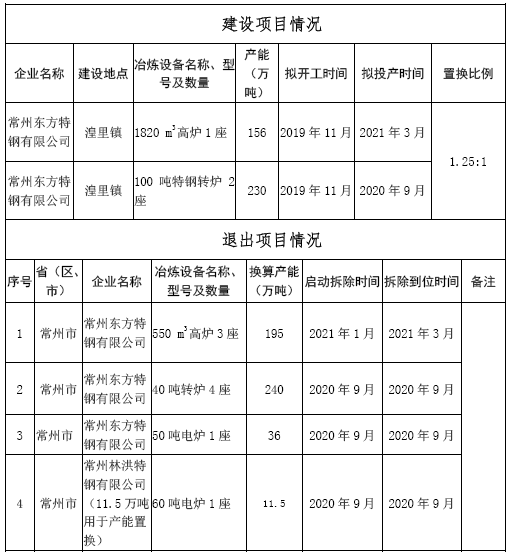 常州东方特钢有限公司钢铁项目产能置换方案的公示