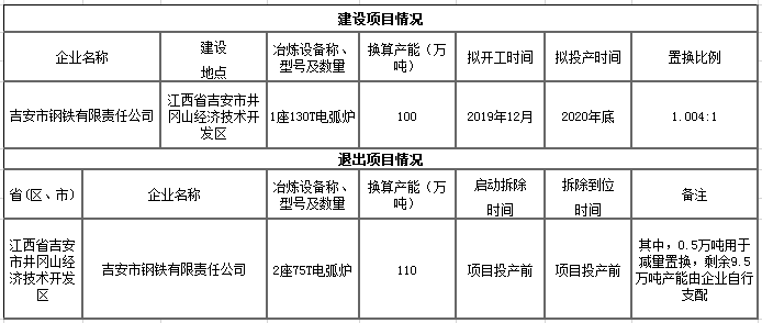 2019年10月30日至2019年11月26日,按照《国务院关于化解产能严重过剩矛盾的指导意见》、《国务院关于钢铁行业化解过剩产能实现脱困发展的意见》和《钢铁行业产能置换实施办法》要求,江西省工业和信息化厅将吉安市钢铁有限责任公司电弧炉节能环保升级易地改造项目产能减量置换进行了公示,公示期间无异议,现予以公告,欢迎社会公众进行监督。