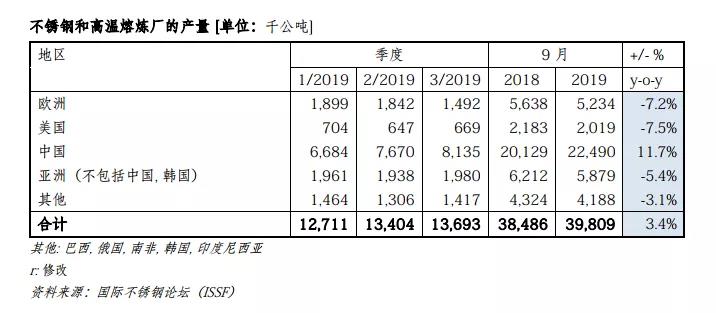 国际不锈钢论坛(ISSF)12日发布的2019年前三季度数据表明,全球不锈钢粗钢产量与去年同比增长3.4%,达到3981万公吨。