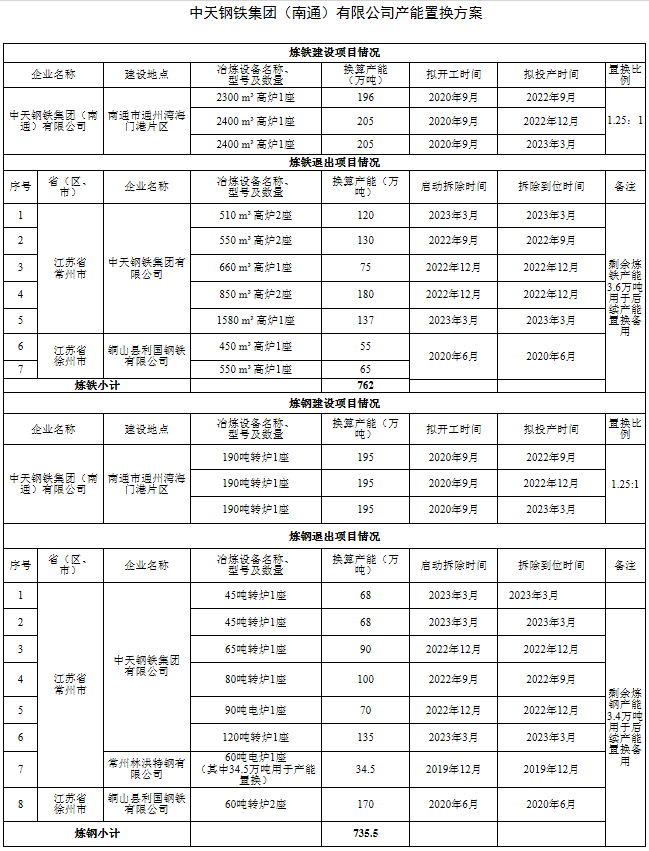 关于中天钢铁集团(南通)有限公司产能置换方案的公告