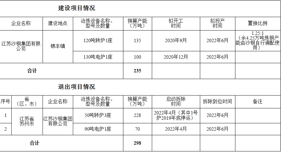 关于江苏沙钢集团有限公司炼钢项目产能置换方案的公告