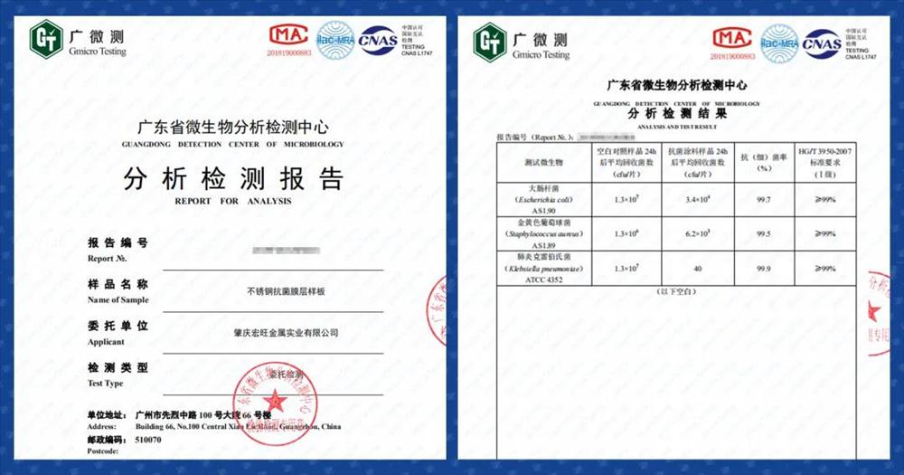 日前,由宏旺投资集团有限公司攻关研发,具有自主知识产权的一种新型抗菌功能性不锈钢产品投入试产。产品经广东省微生物分析检测中心权威检验,对常见的大肠杆菌、金黄色葡萄球菌、肺炎克雷伯氏菌等抗菌率均达99%以上,具备优良的广谱抗菌性。