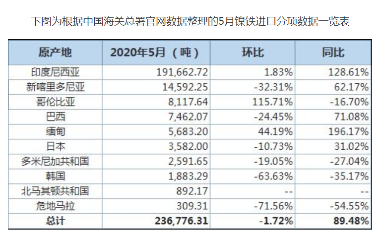 海关数据显示,2020年5月中国镍铁进口总量23.68万吨,环比减少0.39万吨,降幅1.64%;同比增加11.59万吨,增幅95.88%。其中,5月中国自印尼进口镍铁量19.17万吨,环比增加0.37万吨,增幅1.91%,同比增加10.78万吨,增幅128.64%。
