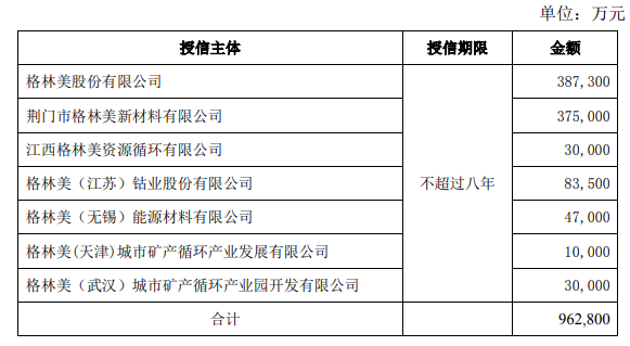 格林美(无锡)能源材料有限公司、格林美(天津)城市矿产循环产业发展有限公司、格林美(武汉)城市矿产循环产业园开发有限公司因原有授信额度到期, 为满足公司及下属公司经营发展需要,保证公司战略的实施,公司及下属公司本次拟申请总额度不超过等值人民币96.28亿元的综合授信。