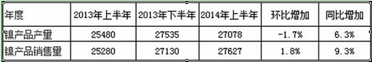 中国铁合金网讯:巴黎7月30日消息,法国埃赫曼Eramet发布了其2014年上半年镍产量和销售状况。报告显示,因2014年3月份镍价开始上涨,今年上半年镍销售额同比增加3.5%。上半年镍产量同比增加了6.3%至27078吨,2013年同期产量为25480吨;销量增加9.3%至27627吨。