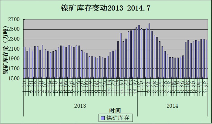 图二:2013年1月-2014年7月中国主港镍矿库存统计图(单位:万吨)