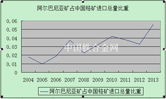 中国铁合金网讯:阿尔巴尼亚是中国铬矿进口主要来源国之一,而且由近十年中国铬矿进口数据来看,阿尔巴尼亚铬矿占中国铬矿进口比重基本呈现震荡上扬趋势。2013年中国铬矿进口总量达到了1209万吨,其中,阿尔巴尼亚矿为67.6万吨,占总量的5.5%。