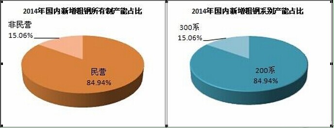 对比2014年国内不锈钢新增粗钢产能数据及结构我们发现有以下几个方面的特点:第一,新增炼钢工艺为清一色的一体化工艺,这将是未来新增炼钢的新常态;第二,新增粗钢产能所有制中,民营企业占比达到近85%,非民营所有制占比中亦有民营参股,也就是说民营依旧是国内新增粗钢产能的主力军;第三,新增粗钢产能中,向200系定向释放比例达到近85%,这也说明国内200系炼钢工艺的成熟度较高,且风险控制能力较强。