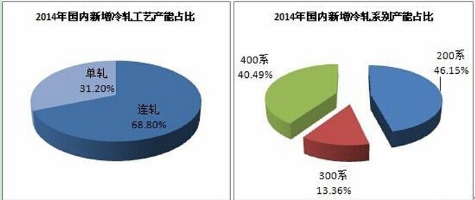 对比2014年国内不锈钢新增冷轧产能的数据及结构我们发现有以下几方面的特点:第一,从新增冷轧设备工艺来看,采用连轧工艺的产能占比达到近69%,这也是未来不锈钢冷轧行业的趋势;第二,新增冷轧产能中,非民营占比达到56.68%,这就反衬出2014年国内民营冷轧产能新增个体多,而单个民营体新增产能较小;第三,从新增冷轧产能对应生产的钢种系别来看,针对200系的冷轧产能占比最大,这也凸显出200系仍具旺盛的生命力。