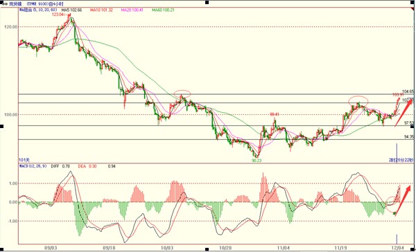 从支撑和阻挡来看,价格向上强势突破103压制,后市目标分别为105、107和110。