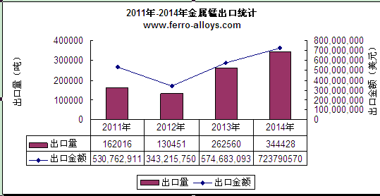 中国铁合金网讯:根据海关总署信息中心最新统计数据,2014年全年,我国金属锰(811100 锰及其制品,包括废碎料)出口到43个国家和地区。金属锰出口总量达到34.4万吨,比2013年(26.3万吨)上升约31%。出口金额达到7.24亿美金,比2013年(5.75亿美金)上升约26%。受价格降低等因素影响,出口量较去年同期大幅增长,而出口金额并未同步增加。