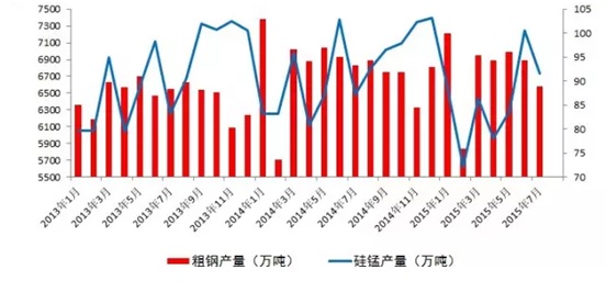 一、产量:2015年1-7月粗钢产量累计47604.2(万吨),较之2014年同期(48482.7万吨)下降1.8%,而硅锰1-7月产量累计594.25万吨,较之2014年同期(619.4万吨)下降0.41%,单从数据看(图二),硅锰产量下降速度并无粗钢产量下滑速度快,这也是为什么今年价格直线下降,供大于求的格局严重困扰着硅锰市场。