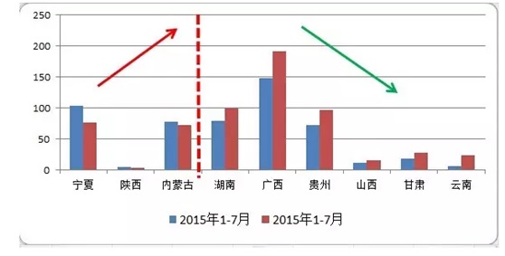 2015年硅锰产区总增长量仍在往北迁移,2014年硅锰产量占比:南方49%、北方43%、其他地区8%到2015年的占比:南方58%、北方37%、其他地区5%,而具体从上图(图三)可以看出,2015年硅锰产量增长均出现在北方2大产区,尤其北方宁夏产区,硅锰产量增长量达到了26.4万吨。