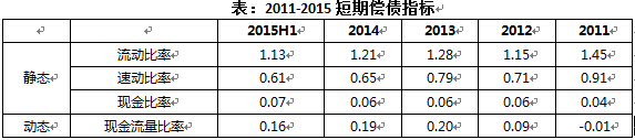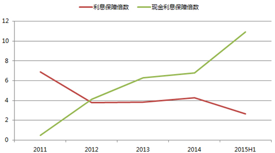 2、偿付利息的能力:利息保障倍数一般认为需大于1 ,否则会有破产倒闭的危险,其数值越高越好,从上图可见,嘉能可该指标一直大于2,表面无破产危机,但是需要注意的是,其2015年上半年的保障能力比2014年下降37.74%,与2014年同期下滑了40.53%。而现金利息保障倍数保持着上升的势态,表明其用经营活动所得的现金偿付债务利息的能力还是比较强劲滴。