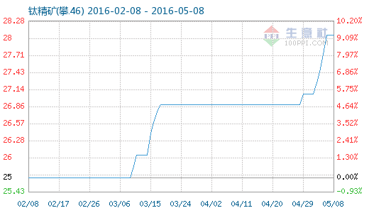 中国铁合金网讯:5月9日钛精矿(攀.46)商品指数为28.35,较昨日上升了0.3点,较周期内最高点100.00点(2012-10-30)下降了71.65%,较2015年04月16日最低点24.02点上涨了18.03%。(注:周期指2012-09-01至今)