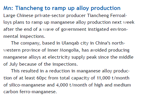 因为环保检查,化德天成自从7月中旬以来,在用电高峰时段停止生产锰合金。