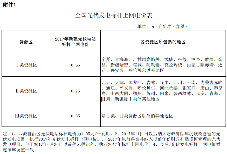 根据当前新能源产业技术进步和成本降低情况,降低2017年1月1日之后新建光伏发电和2018年1月1日之后新核准建设的陆上风电标杆上网电价,具体价格见附件1和附件2。2018年前如果新建陆上风电项目工程造价发生重大变化,国家可根据实际情况调整上述标杆电价。之前发布的上述年份新建陆上风电标杆上网电价政策不再执行。光伏发电、陆上风电上网电价在当地燃煤机组标杆上网电价(含脱硫、脱硝、除尘电价)以内的部分,由当地省级电网结算;高出部分通过国家可再生能源发展基金予以补贴。