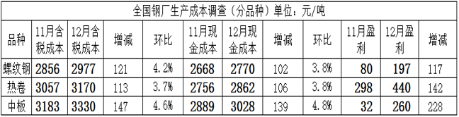 我们调查的全国91家高炉钢厂,12月底螺纹钢平均含税成本为2977元/吨,月环比增加121元/吨,增幅4.2%,盈利197元/吨,增加117元/吨;热卷为3170元/吨,环比增加113元/吨,增幅3.7%,盈利440元/吨,增加142元/吨;中厚板为3330元/吨,环比增加147元/吨,增幅4.6%,盈利为260元/吨,增加228元/吨;
