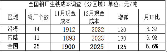 (2)、12月底对全国25家长流程高炉生产企业的调研了解,目前生铁不含税价格为2025元/吨,环比增加135元/吨,增幅7.1%。