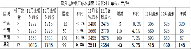 分区域来看,华东地区12月底废钢采购价为1715元/吨,月环比减少12元/吨,降幅0.7%;螺纹钢含税成本为2475元/吨,环比减少5元/吨,降幅0.2%。华南地区12月底废钢采购价为1775元/吨,环比增加50元/吨,增幅2.9%;螺纹钢含税成本为2770元/吨,环比增加110元/吨,增幅4.1%。西南地区12月底废钢采购价为1833元/吨,环比增加180元/吨,增幅10.9%;螺纹钢含税成本为2654元/吨,环比增加143元/吨,增幅5.7%。