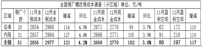 螺纹钢方面,12月底对全国51家螺纹钢生产企业调研了解到,螺纹钢平均成本为2977元/吨,环比增加121元/吨,增幅4.2%;分区域来看,沿海地区20家钢厂螺纹钢平均成本为2968元/吨,环比增加114元/吨,增幅4.0%;内陆地区31家钢厂螺纹钢平均成本为2984元/吨,环比增加127元/吨,增幅4.4%;盈利空间方面,12月份螺纹钢生产企业盈利空间在197元/吨,环比增加117元/吨。12月份螺纹钢利润空间回升,但目前高炉厂螺纹钢盈利空间整体仍旧低于短流程钢,由于市场南北价差明显,目前南方地区钢厂利润空间强于北方钢厂。