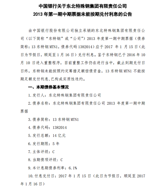 [导读]中国铁合金网讯:1月16日,据中国银行关于东北特殊钢集团有限公司的公告称,东北特钢2013年第一期中期票据未按期足额兑付利息,13东特钢MTN1已构成实质性违约。据悉,东北特钢去年已出现数次违约。