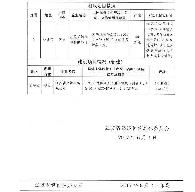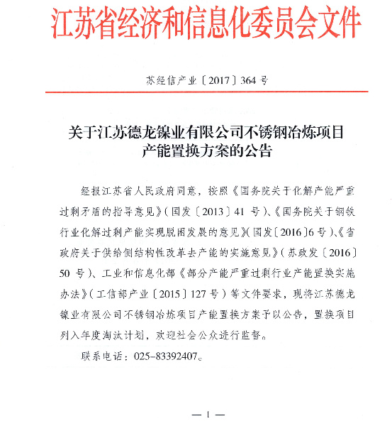 江苏省经信委就关于江苏德龙镍业不锈钢项目产能置换方案已经批露并予以正式公告。
