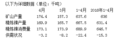今年前四个月,全球精炼镍产量增长5.7%至667,500吨,全球精炼镍消费量跳增6.7%至689,900吨。