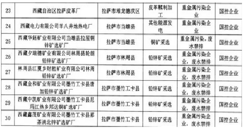 8月10日,西藏自治区环保厅印发了57家重点监控企业(含28家国控企业)其中废水企业15家,废弃企业7家,重金属污染企业22家,城镇污水处理厂4家,危险废物(医疗废物)处置企业5家,规模化畜禽养殖厂4家。其中,22家重金属污染企业基本隶属国企,企业整理如下: