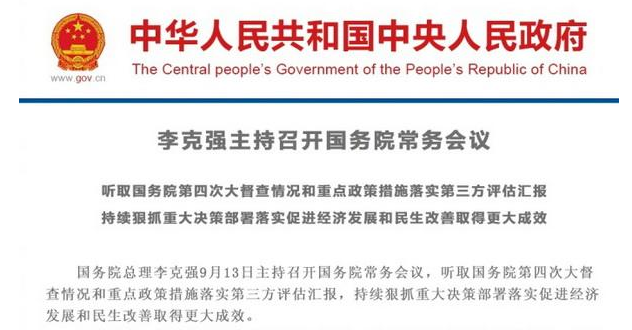 国务院总理李克强9月13日主持召开国务院常务会议,听取国务院第四次大督查情况和重点政策措施落实第三方评估汇报,持续狠抓重大决策部署落实促进经济发展和民生改善取得更大成效。