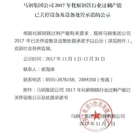 现将马钢集团公司2017年已关停设备及设备处置承诺予以公示(详见附件)。欢迎社会各界监督。