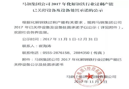 现将马钢集团公司2017年已关停设备及设备处置承诺予以公示(详见附件)。欢迎社会各界监督。