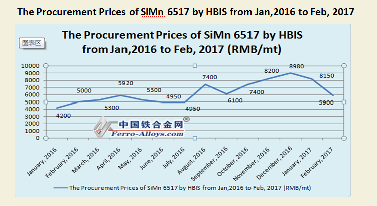 据中国铁合金网信息22日监测:宁夏地区硅锰合金现款提货价,硅锰6517#(含税出厂价):6500元,微涨100元;包到北方钢厂港6800-6900元;内蒙地区 硅锰合金现款提货价,硅锰6517#(含税出厂价:6400元,包到钢厂价格6700-6800元;南方重庆地区现款出厂价:7000元。到钢厂报价7200元。价格继续维持相对稳定。相比2016年11月硅锰出厂平均价8225元,12月8450元,今年的同期硅锰价格下跌1525元。降幅约为18.5%。下图为2016年1-2017年2月的硅锰采购价。回顾2016年1月的钢厂采购价硅锰4300元,目前马上又到年底和临近春节,硅锰价格走势至关重要。