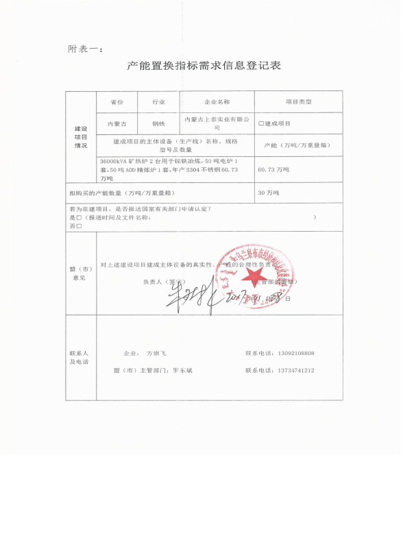 内蒙古上泰实业有限公司已建成36000kva矿热炉2台用于镍铁冶炼,50吨电炉1套,50吨AOD精炼炉,年产S304不锈钢60.73万吨。拟购买的产能数量30万吨。