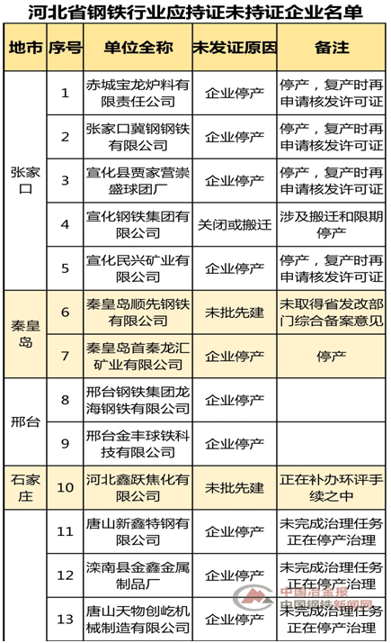 因搬迁、停产、未批先建等原因,河北90家钢企未获排污许可证(附名单)