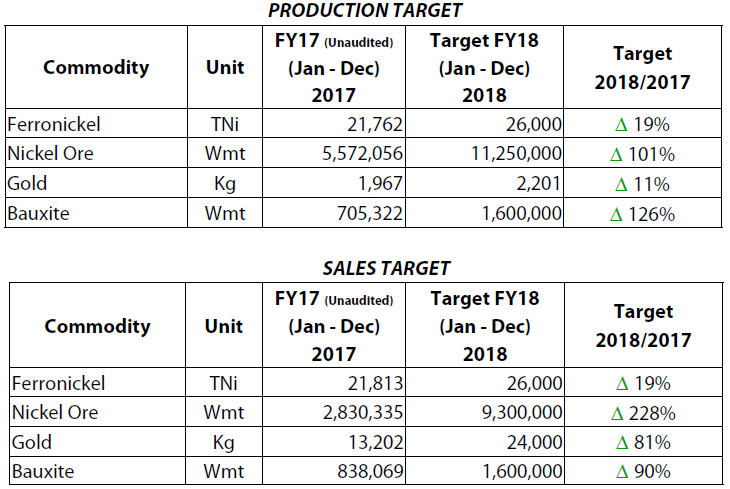 安塔姆承诺,在印尼矿业的下游产业有所发展,从而获得了出口低品位镍矿(少于1.7%)3900万湿吨以及85万湿吨铝矾土矿石的许可。为适应形势,安塔姆在2018年计划镍矿产量达到1125万吨,主要用于安塔姆镍铁厂的原料,以满足国内及出口市场的需求。在2018年,安塔姆镍矿销售目标930万湿吨,同2017年283万湿吨的销售量相比增加了228%。安塔姆在2018年铝矾土的生产及销售量目标均为160万湿吨以满足国内及出口市场的需求。