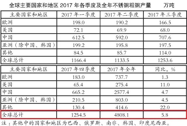 分季度看,2017年四季度全球不锈钢粗钢产量为1254.5万吨,比三季度的1253.6万吨仅增长0.9万吨。而一季度和二季度均未达到1200万吨,全年产量呈现先抑后扬走势。分地区看,欧洲不锈钢粗钢产量一季度达到全年最高值198.0万吨,到三季度降至166.5万吨,降幅达15.9%,四季度产量回升至183.0万吨;美国不锈钢粗钢产量一季度达到全年最高,为72.1万吨,随后逐步下降,至四季度下滑9.3%至65.4万吨;中国不锈钢粗钢产量在三季度达到最高值707.6万吨,之后转入下降;巴西、俄罗斯、南非、韩国、印度尼西亚不锈钢粗钢产量总和从一季度的84.5万吨开始上升,至四季度增加至130.4万吨,增幅高达54.3%。(来源:世界金属导报)