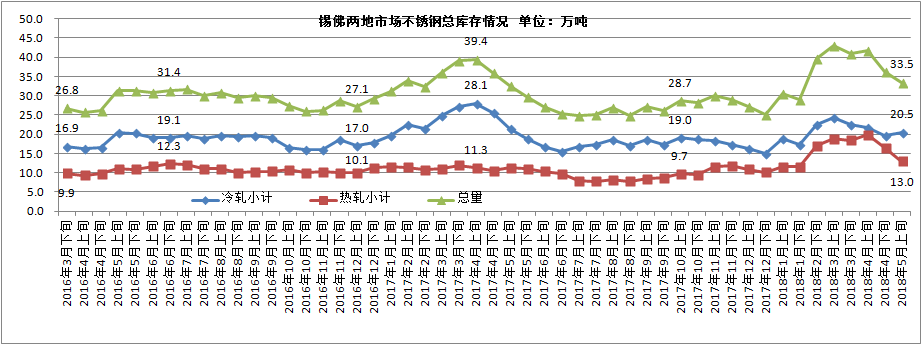 【中国铁合金网讯】5月中旬市场库存环比4月底库存下跌2.7万吨至33.5万吨。另外,无锡电子盘可交割库存量下跌0.2万吨至4.3万吨,不包含于统计范围内。虽然当前整体库存尚处于中高位置,但市场整体库存基本上以钢厂库存前移为主,而贸易商和下游用户基本上“轻仓上阵”。钢厂控制不锈钢资源出货节奏,致使市场资源偏紧,价格悄然上涨。