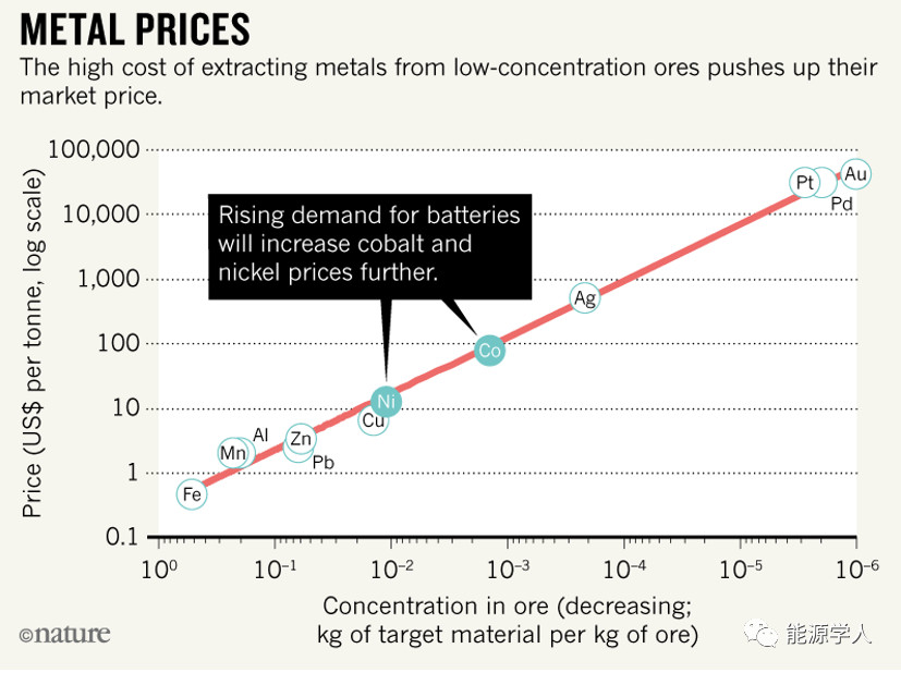 如果我们现在还不做出改变,随着LIBs的需求量持续增长,预计到2030年钴会断货,同样的镍可能会在2037年或更早一点断货。电池需求不断增长,撑爆了目前开采和提炼能力后,将来在高价的诱惑下,生产厂家可能会利用质量较差的矿石为原料,但随之而来的是加工成本被抬高。