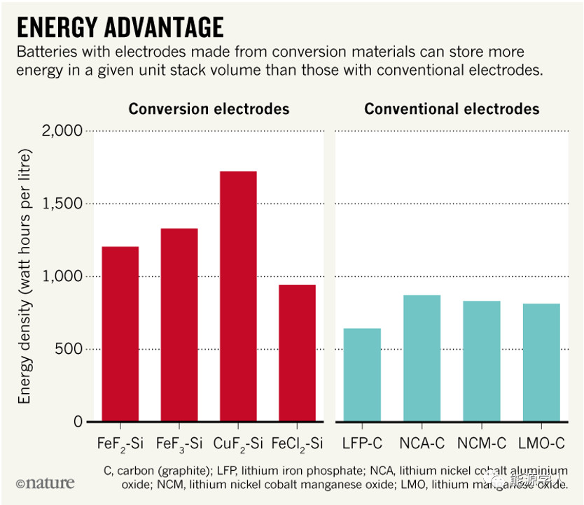 如果用普通金属(铁、铜)来制造锂离子电池正极材料,则足以供应数十亿电池。比如铁不仅价格低廉(6至6美分/kg)而且储量丰富(760亿吨)。传统的富铁材料(LFPs; LiFePO4)和富锰材料(LiMnO2或LiMn2O4)都存在种种缺点,因此最有希望的替代方案是在电极中使用“转换型正极材料”。铜/铁氟化物和硅可与锂离子反应来实现锂的存储,可以容纳比标准正极多六倍的锂。