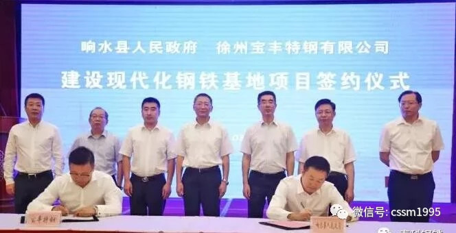 【中国铁合金网讯】重大项目是推进“两海两绿”战略部署、实现经济发展高质量的关键抓手和重要支撑。8月22日,响水县与徐州宝丰特钢有限公司正式签约建设现代化钢铁基地项目。据了解,从8月3日初步对接到8月22日成功签约,前后只用19天、4次对接洽谈!总投资500亿元,占地面积约7000亩、年产800万吨现代钢铁基地、一期投产达效后可实现开票销售200亿元以上、带动就业6000人以上……一系列亮点元素让这个大项目备受瞩目。盐城市委书记戴源、宝丰特钢公司董事长金连春出席签约仪式。