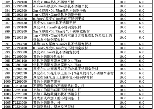 进口商品最惠国税率调整表(不锈钢相关部分)