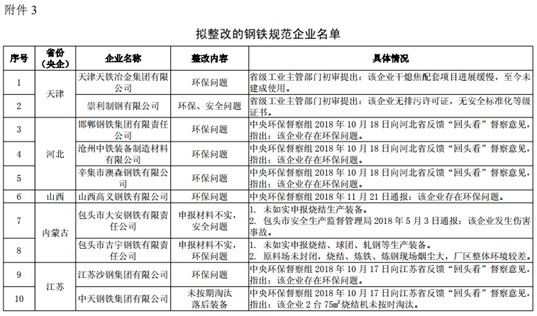 根据《钢铁行业规范条件(2015年修订)》和《钢铁行业规范企业管理办法》,工业和信息化部持续开展钢铁规范企业动态调整工作。经企业自查、地方工业主管部门初审、工业和信息化部组织专家核实,其中,12家企业符合《钢铁行业规范条件》,拟列入规范企业名单;11家企业存在违规新增产能、冶炼设备拟全部关停退出等情形,拟撤销规范公告;17家企业存在环保、安全等问题,拟责令整改;27家企业冶炼装备变化、7家企业名称变化,拟予以变更。