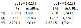 【中国铁合金网讯】据外电1月14日消息,官方海关数据显示,俄罗斯2018年1-11月铝和镍出口下滑,铜出口增加。