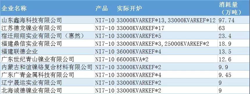 2019年1月国内高镍铁厂家镍矿消耗量排名如下:山东鑫海科技有限公司97.74万吨,江苏德龙镍业有限公司63万吨,宿迁翔翔实业有限公司23.4万吨,福建鼎信实业有限公司18.9万吨,福建联德企业13.5万吨,广东世纪青山镍业有限公司12.6万吨,内蒙古硕丰实业有限公司(奈曼旗禾硕复合材料有限公司)9.9万吨,广东广青金属科技有限公司9.45万吨,辽宁晟运实业有限公司9万吨,阳江翌川金属科技有限公司9万吨。