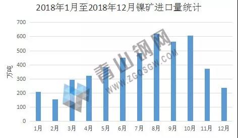 据海关数据显示,我国12月进口镍矿236.05万吨,较11月减少134.58万吨,环比减幅36.31%;较去年同期减少19.07万吨,同比减幅7.47%。