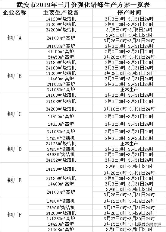 1、武安市钢铁行业2019年3月3日至3月31日错峰生产方案,按照在A方案的基础上,强化管控加严10%的限产负荷执行,不再执行《武安市大气污染防治工作领导小组关于对2019年二三月份涉气工业企业强化应急管控工作的通知》(武气领组〔2019〕2号)有关要求。