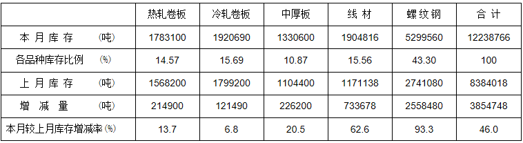 本月5大品种钢材社会库存环比全部上升,其中热轧卷板库存环比上升13.7%,冷轧卷板库存环比上升6.8%,中厚板库存环比上升20.5%,线材库存环比上升62.6%,螺纹钢库存环比上升93.3%,库存合计环比上升46.0%,详见下表。