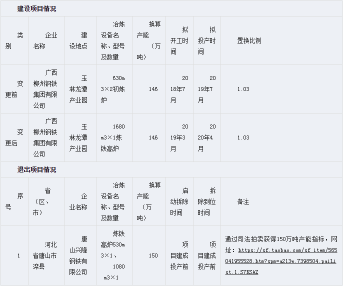 从公告显示,广西柳州钢铁集团有限公司位于玉林龙潭产业园的不锈钢项目,此次置换方案变更,是将初炼炉变更成相对高大上的炼铁高炉,而且设备产能变更上也做了更符合趋势的调整。